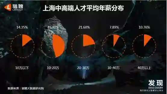在上海地区,中高端人才的平均年薪主要分布在10-20万区间,占比为45.41%,在所有中高端人才中占比最大;其次是20-30万区间,占比为21.60%。