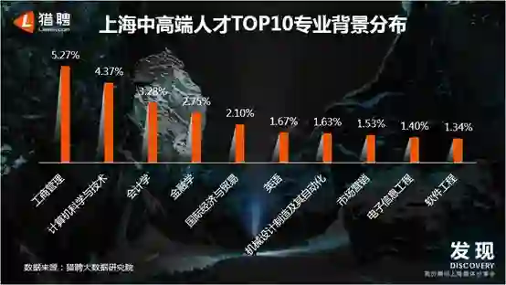 从上海中高端人才TOP10专业背景分布来看,跟经济管理相关的专业占比最多,其中工商管理占比最高,为5.27%。这跟上海发达的金融业高度相关,也跟上海金融业吸纳众多中高端人才密不可分。