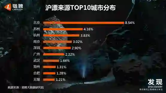 从沪漂来源TOP10城市来看,北京流入上海的中高端人才占比最多,为8.54%,位居第一。而名列第二、第三、第四的城市是苏州、杭州和南京,都是来自临近上海的城市,占比分别为4.16%、3.83%、3.02%;名列第五的是深圳,占比为2.90%。