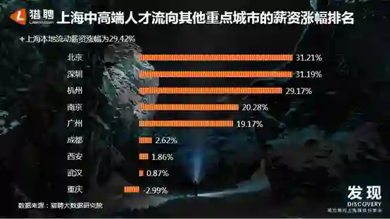 上海中高端人才流向其他城市的薪资涨幅排名第一的是北京,为31.21%;深圳排名第二,薪资涨幅为31.19%,略高于上海本地流动产生的薪资涨幅;杭州排名第三,薪资涨幅为29.17%。