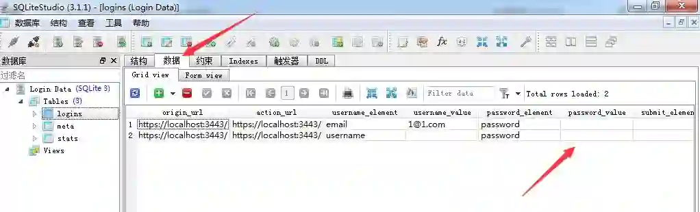 如果Chrome正在运行,无法使用SQLiteStudio打开数据库文件Login Data,可将该文件复制后再打开。