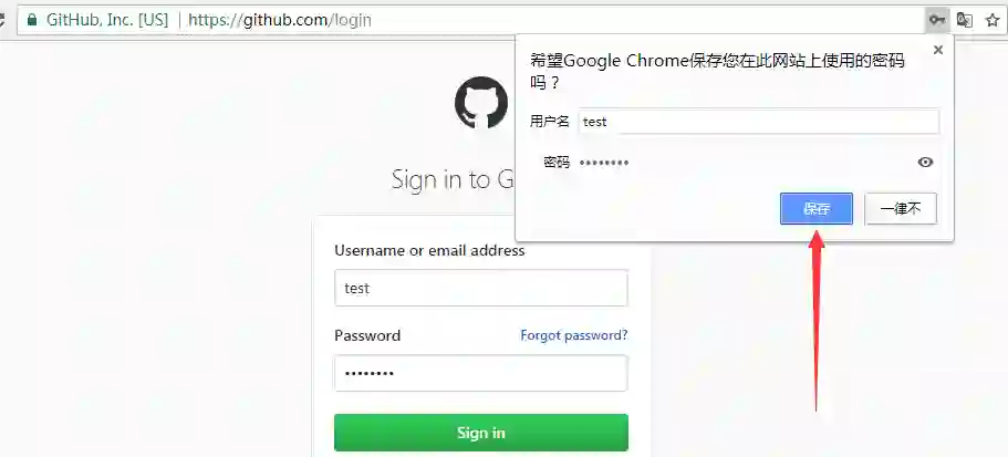 正常用户在访问网站时,可选择使用Chrome浏览器保存登录的用户密码,用于下次登录的时候Chrome自动填写登录密码,如下图: