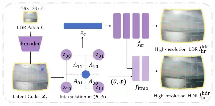 在阶段二中,作为阶段一中离散表征的补充,我们将全景图建模为连续球面场,即可以使用任意球面坐标来查询得到一个高动态范围像素值。这一建模同时满足了超分辨率(低分辨率到高分辨率)和逆向色调映射(低动态范围到高动态范围)两种需求。具体而言,如下图所示,我们首先使用卷积网络将图像块编码为与像素对齐的潜在特征向量。对于连续球面上的任意位置,我们利用区域插值从其四个近邻特征向量中获得其特征,并最终使用两个 MLP 得到输出的 HDR 像素值。