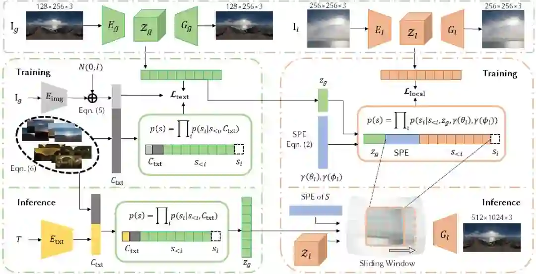 1)全局 - 局部层级码本:我们使用 VQVAE 的训练方法,将极低分辨率的全景图嵌入到全局 (global) 码本中,将高分辨率的图像块 (patch) 嵌入到局部 (local) 码本中。这样一来就可以从全局码本中采样具有空间一致性和整体感的全局特征,同时从局部码本中采样获得局部细节。