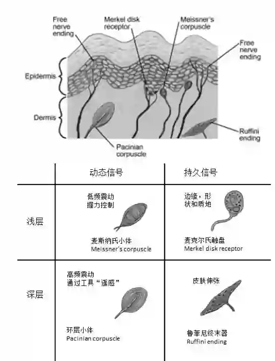 人的手指的肌肤真是很奇妙。在方寸之地,表皮和真皮中竟然遍布了密密麻麻的血管和神经组织。神经感受器就有五种之多:一个拉伸感受器——鲁菲尼终末器(Ruffini ending),两个触觉感受器——麦克尔氏触盘(Merkel disk receptor)和麦斯纳氏小体(Meissner’s corpuscle),一个压力感受器——环层小体(Pacinian corpuscle),还有用来感受温度、疼痛的游离神经末梢。所以,当我们用手去触摸人或物时,得到的感觉是四、五种信号通过神经传导,先到脊髓、脑干、和丘脑,再传到大脑皮层综合并处理之后的信号总汇。