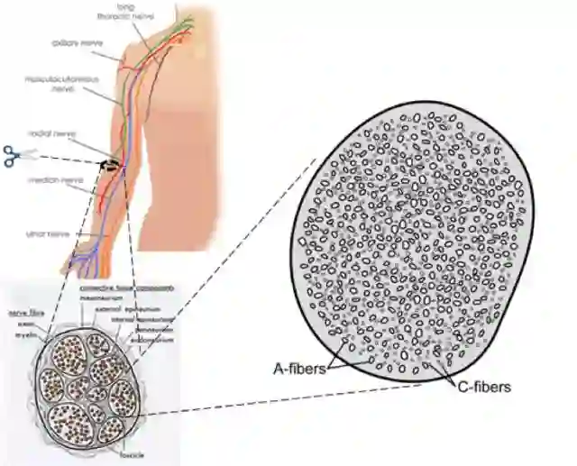 ►和其它神经相似,支配前臂侧面肌肤的肌皮神经(musculocutaneous nerve)的横断面会看到很多有膜隔开的神经纤维束。每束都含有粗细不等的神经纤维。最粗的是A-纤维,表面有髓鞘层层包裹。最细的就是C纤维,它没有髓鞘包裹,所以传递信号的速度最慢:每秒0.5至1.3米。