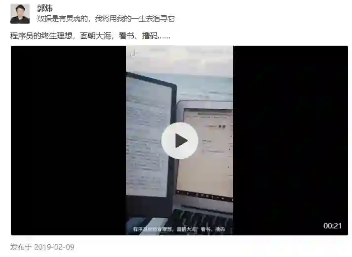 敲完代码,还不忘发个状态,说“程序员的终生理想,(就是)面朝大海,看书、撸码……”