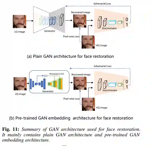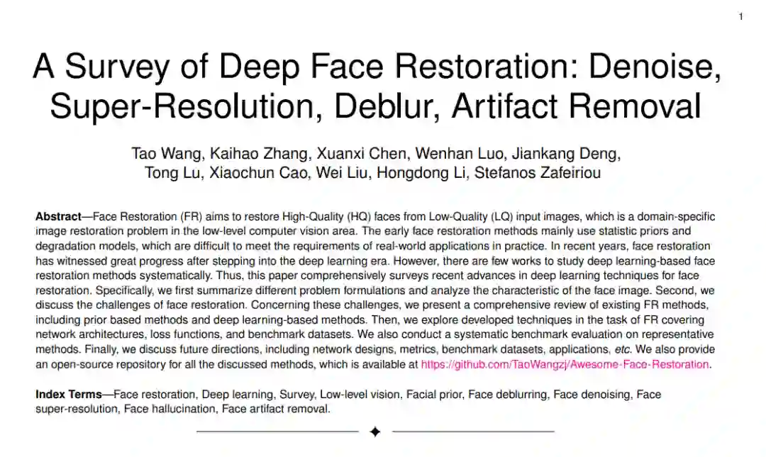 人脸恢复(Face Restoration, FR)旨在从低质量(Low-Quality, LQ)输入图像中恢复高质量(High-Quality, HQ)的人脸,这是低层次计算机视觉领域中一个特定领域的图像恢复问题。早期的人脸恢复方法主要采用统计先验和退化模型,在实际应用中难以满足实际应用的要求。近年来,人脸修复技术在进入深度学习时代后取得了长足的进展。然而,系统研究基于深度学习的人脸恢复方法的工作还很少。因此,全面综述了深度学习技术在人脸复原方面的最新进展。具体而言,我们首先总结了不同的问题公式,并分析了人脸图像的特征。其次,讨论了人脸复原面临的挑战。针对这些挑战,我们对现有的FR方法进行了全面的回顾,包括基于先验的方法和基于深度学习的方法。然后,我们探讨了FR任务中开发的技术,包括网络架构、损失函数和基准数据集。我们还对有代表性的方法进行了系统的基准评价。最后,我们讨论了未来的方向,包括网络设计、度量、基准数据集、应用程序等。我们还为所有讨论过的方法提供了一个开源存储库,可在