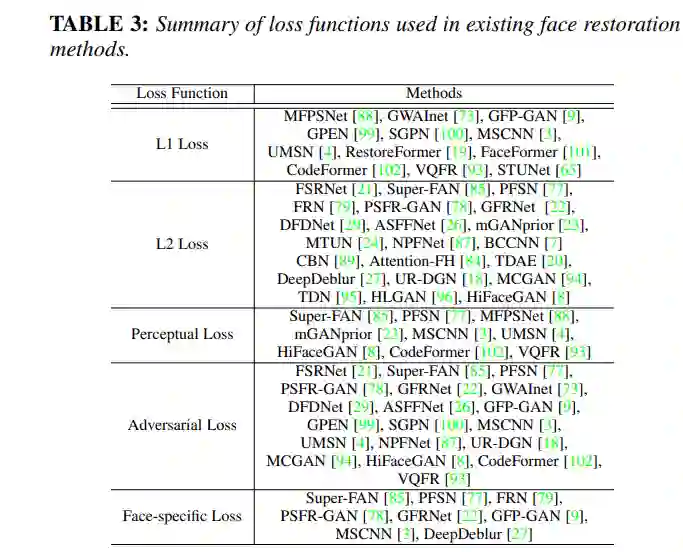 为了优化人脸修复网络,文献中提出了许多损失函数。一般来说,现有方法中使用的损失函数可以大致分为像素损失、感知损失、对抗性损失和面部特定损失。