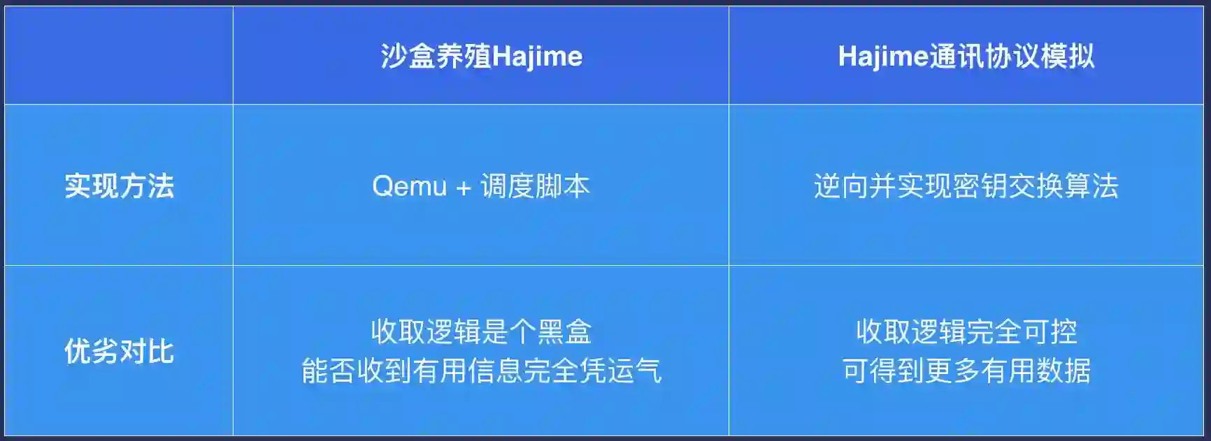 Hajime的跟踪工作是如何进行的?第一项是评估网络规模,每日更新跟踪结果。另一项工作就是定期获得HTTP网络中传播的文件和指令。对于Hajime的跟踪主要可以通过两种方式进行:一是通过沙盒来养殖Hajime蠕虫,定期查它的情况。二是自己实现一个伪装的Hajime节点,混入Hajime的网络,尝试跟它通信。养殖Hajime可以通过“Qemu模拟”加“调度脚本”来实现。至于Hajime的伪装实现,则需要逆向Hajime的所有代码,实现它的核心逻辑。我刚刚已经提到了,Hajime这个僵尸网络有很强的密码学特征,它在密钥交换代码这一块并没有找到开源项目可以完全支持,我们要一行一行地逆出并实现它,这块的工作量也是很大的。