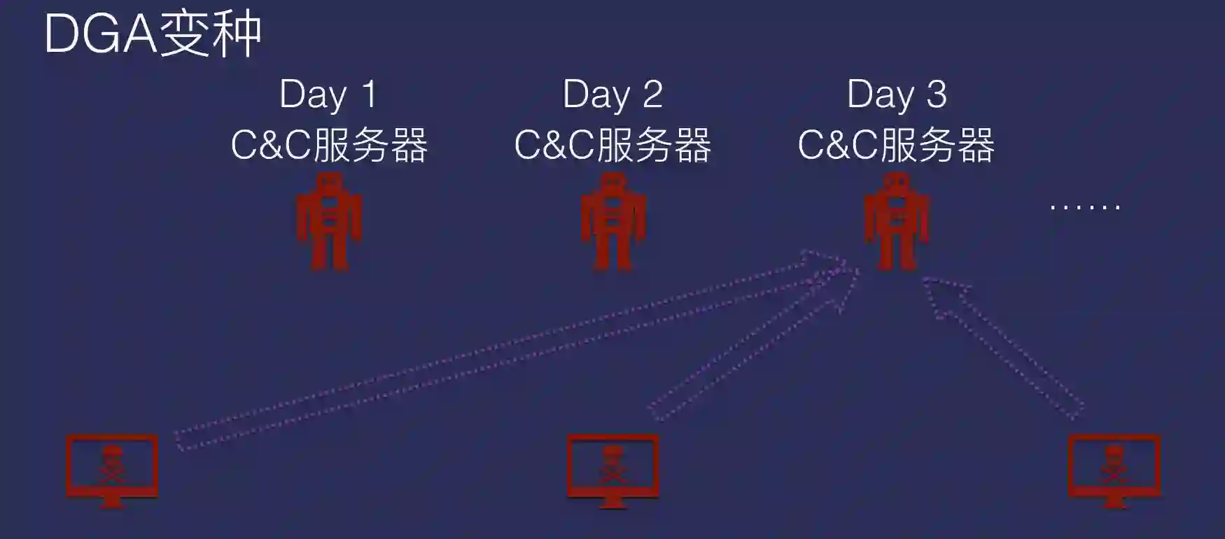 在公布的过程中,还有另外一个重要的工作,我们第一个确认了MIRAI的DGA变种,而且率先公布了DGA数据。很多人不理解DGA究竟是什么。一般情况下,僵尸网络下面都是肉鸡,肉鸡从CC服务器接收指令,CC服务器告诉我这个肉鸡究竟要攻击谁。按传统的情况来说,我们只要把CC服务器关掉就行。无论是把它的IP地址关掉,还是把域名关掉,这些肉鸡都会丧失掉从CC服务器获取攻击指令的途径。但是,攻击者希望自己的控制是持久化的,他做了些改进。每天换一个CC服务器,你第一天关掉第一个,我就第二天启动第二个。当你把第二个关掉了,第三天就启动第三个。这个过程是通过一段代码流程来实现的,得到的域名或者服务器地址是一个数组,也就是从0开始到无穷远的数组。要生成这个数组,需要一个种子。我们拿到这个种子数据,并逆向出对应的域名生成算法后,就可以预测出MIRAI在随后的每一天所使用的CC服务器地址。这样比如我们知道了第100天的CC地址,那么我们可以在第99天的时候将其列入黑名单,以预防其在第100天发起的攻击。