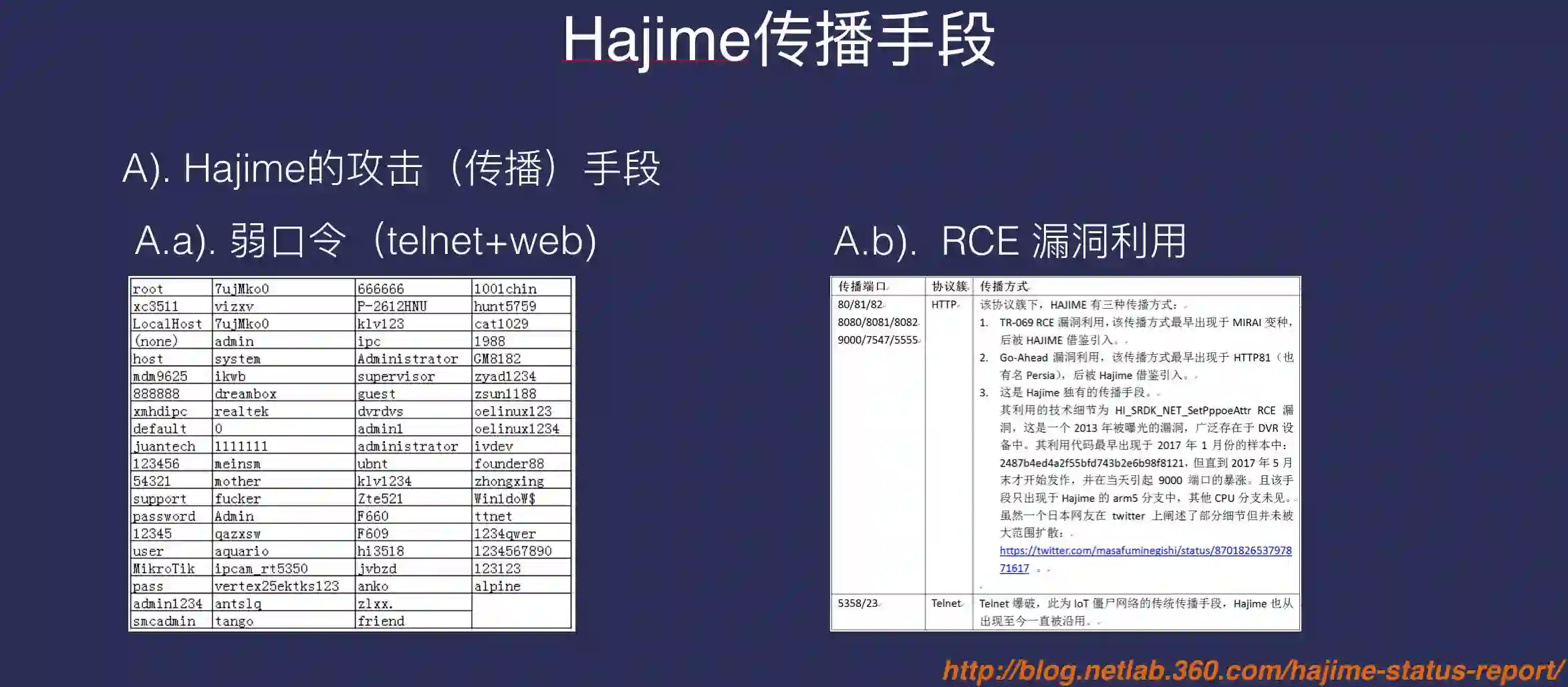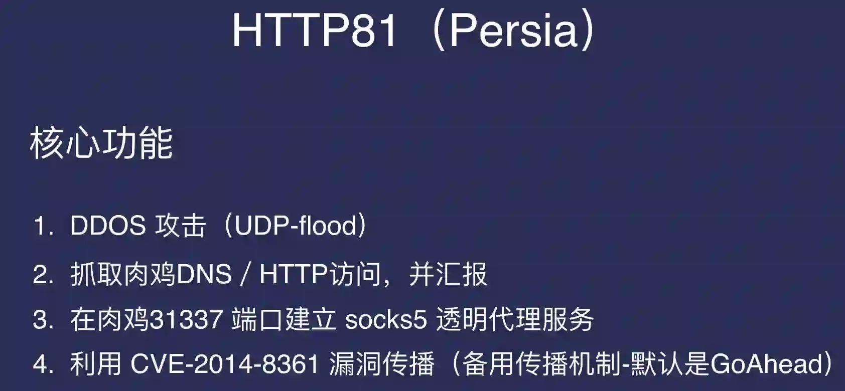 接下来Rootkiter开始介绍“HTTP81”,HTTP81的一部分基础代码其实是和 MIRAI 同源的(我更倾向于相信它是从MIRAI改的)。它和原始MIRAI的区别在于,原始MIRAI是通过弱口令来传播,HTTP81的传播是通过Go-Ahead漏洞进行传播。
