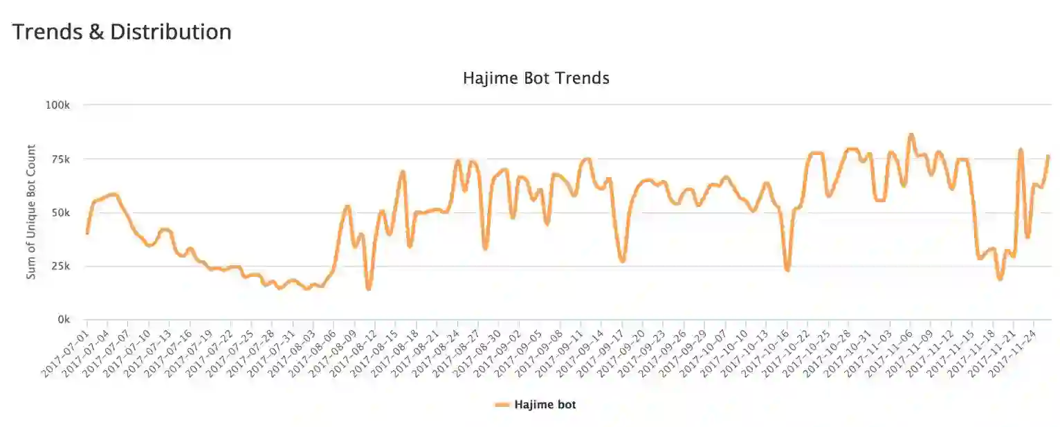 第一次对Hajime进行的规模评估是2017年4月份卡巴斯基的研究员完成的,他得到的结果是那个时候Hajime的节点有30万,我们也有一些数据可以从侧面证明这个结果。Hajime在6月份的时候已经开始下降。9000端口的传播也是Hajime独有的。它利用了HI_RSDK_NET_SetPppoeAttr RCE漏洞。