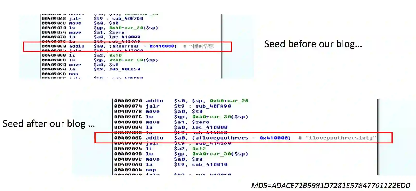 我们在自己的微博上很高兴地公布了DGA变种。公布之后的4小时我们收到了另一个样本。这个样本证明了MIRAI的开发者是个有爱的人。他之前的种子是一段读不懂的一段字符。在我们公布之后,他开始把这段字符改成了“i love you three sixty”。(大魔王注:我爱360)