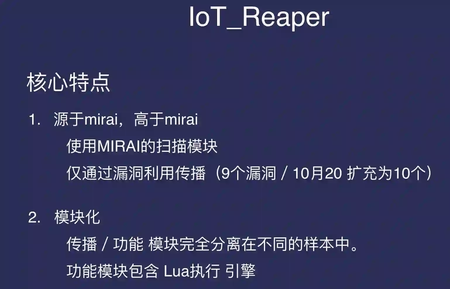 在接下来是“IoT_Reaper”,它也是从MIRAI改过来的,但比MIRAI更高级。首先,它使用了MIRAI的扫描模块。MIRAI的SYN扫描模块速度非常快,在很短的时间内可以得到很多的扫描结果。它不会通过弱口令进行传播,而是完全通过漏洞来传播。从我们报告的时候它有9个漏洞。10月20号的时候,攻击向量已经扩充为10个。在我们监控的时间内,利用这10个漏洞最高曾控制了10万个左右的肉鸡。然后是模块化,传播和攻击功能分在不同的样本中。它虽然是从MIRAI样本改的,改完的样本叫做SA,SA没有攻击功能,只有传播功能。它的攻击功能将同另一个模块有关,在这个模块中包含了一个完整的LUA 脚本执行引擎,攻击者可以通过下发 LUA 代码的方式来控制自己的肉鸡。