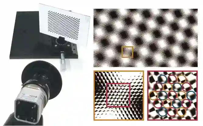 本文提出了一种利用原始图像对多焦距全光相机的几何标定方法。多焦距全光相机的特点在于具备数种在空间上与相机传感器相对齐的微透镜,使得能产生不同放大倍率的微图像。这种多透镜设计在图像处理的计算量上具有优势,但是却使得标定过程较为复杂。我们的方法能检测微透镜的类型、检索出微透镜的空间排列,并且能估计出相机的内参及外参,从而全面刻画具体的相机类型。受经典的针孔相机标定的启发,我们的算法在棋盘格角点上进行开展,其中角点的检索是通过用户的微图像角点检测器实现的。实验设备及原始图像如下图所示: