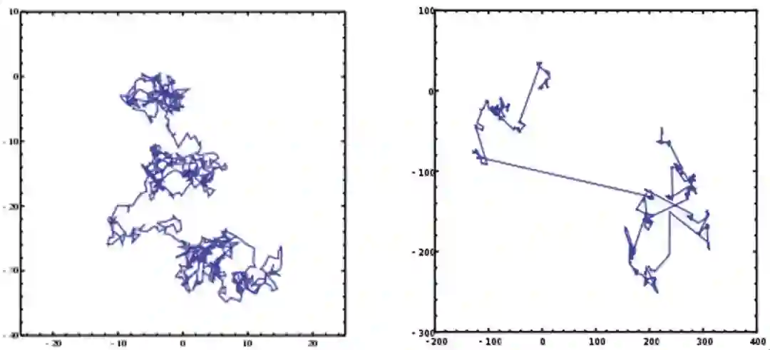 (左图:随机搜索形成的轨迹 右图:Levy飞行搜索形成的轨迹)
