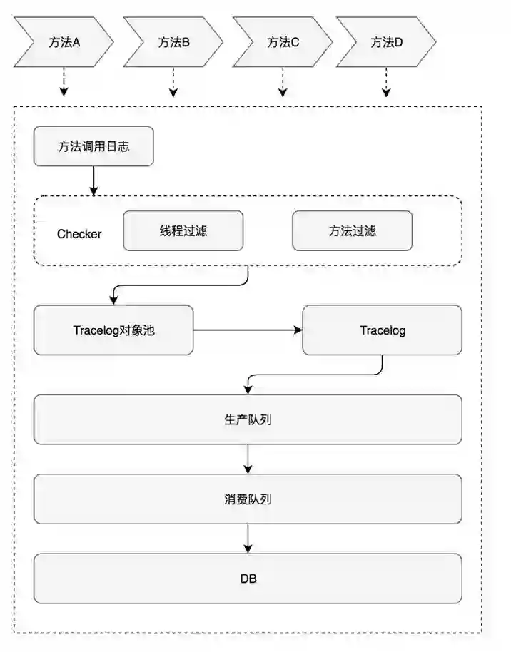 方法运行产生方法调用日志首先会经过checker进行检测,checker包含线程检测和方法检测(减少信息干扰),线程检测主要过滤类似于定时任务这种一直在不断的产生日志的线程,方法检测会在一定时间内检测方法调用的频率,过滤掉频繁调用的方法,方法如果不会被过滤就会进行异步处理,其次向对象池获取一个Tracelog对象,Tracelog对象进入生产队列组装时间、线程、序列号等信息,完成后进入消费队列,最后消费队列到达固定数量之后批量处理存入DB。