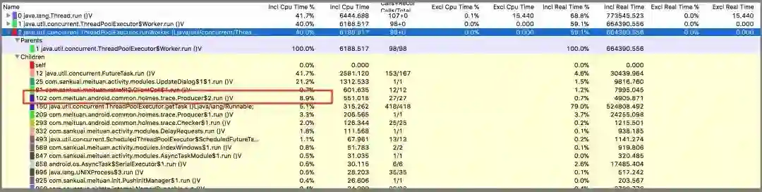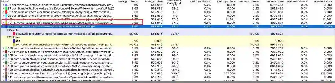 2. 由于数据产生太多,所以在存储DB的时候就会产生大量的IO,导致CPU占用时间过长从而影响其他线程使用CPU的时间。针对这个问题,首先是采取线程过滤和方法过滤来减少产生无用的日志,并且降低处理线程的级别不与主线程争抢CPU时间,然后对数据进行批量处理来减少IO的频率,并在数据库操作上将原来的Delete+insert的操作改为update+insert。Tracelog固定存储30万条数据(大约美团App使用6次以上的记录),如果满30万就删除早期的一部分数据再写入新的数据。操作越久,delete操作越多,CPU资源占比越大。经过数据库操作的实际对比发现,直接改为满30万之后使用update来更新数据效率会更高一些(这里就不做太多的详细说明)。我们的优化成果从起初的CPU占比40%多降低到了20%左右再降到10%以内,这是在中低端的机器上测试的结果。