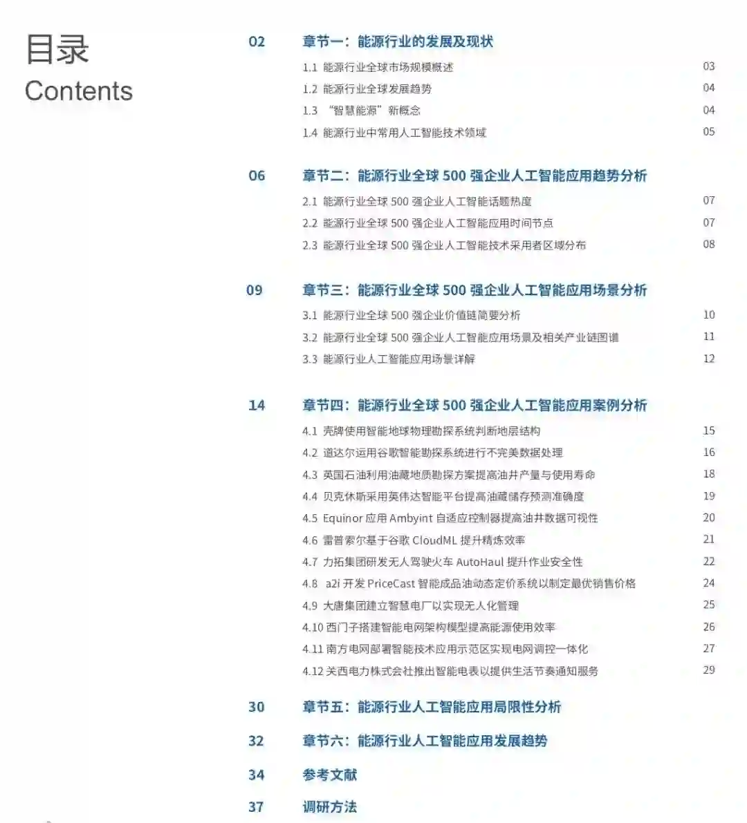 。报告中基于化石能源、电力能源划分了两大人工智能应用领域,并归纳了多个人工智能应用落地场景,更囊括多家能源行业全球 500 强企业案例,从技术与落地层面详细剖析各企业人工智能领域应用。报告目录如下: