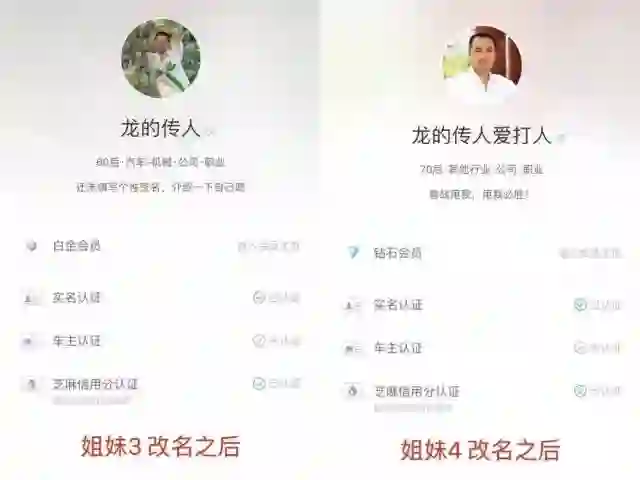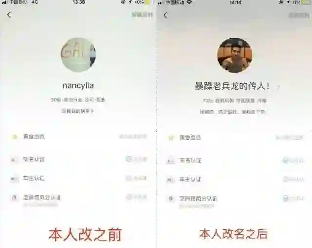 本来一个个都是“小仙女”“小公主”“小可爱”们,画风一改,突然变成了“退伍军人”、“拳击馆馆长”、“龙的传人”…… 这大概是姑娘们能想到的最具安全感形象了,大多数人把名字和职业都改成了这些,并且配上了外表很刚硬的中年男子照片,以求平安。