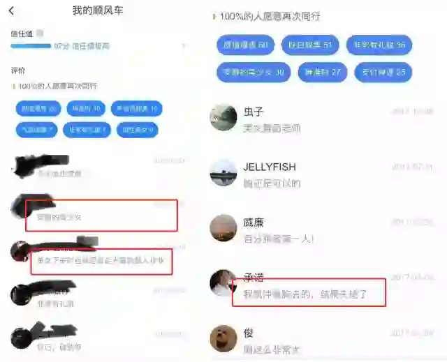 除了宣传,滴滴顺风车的个性化标签和司机评论功能也有很大问题。整改前,滴滴顺风车的接单页面,司机可以看到用户的年龄、职业、头像等信息,还可以看到乘客此前搭乘顺风车的时间、地点、消费价格,以及司机对乘客的评价。(用户自己看不到)