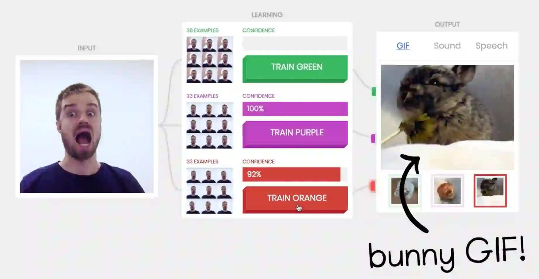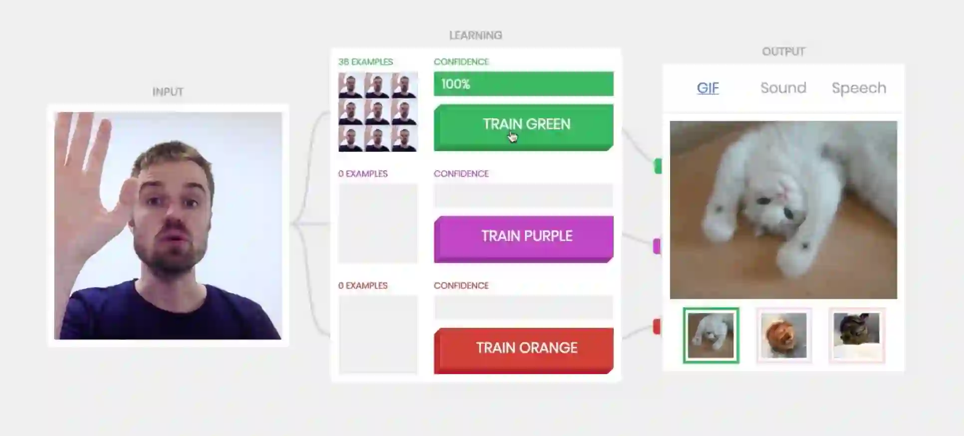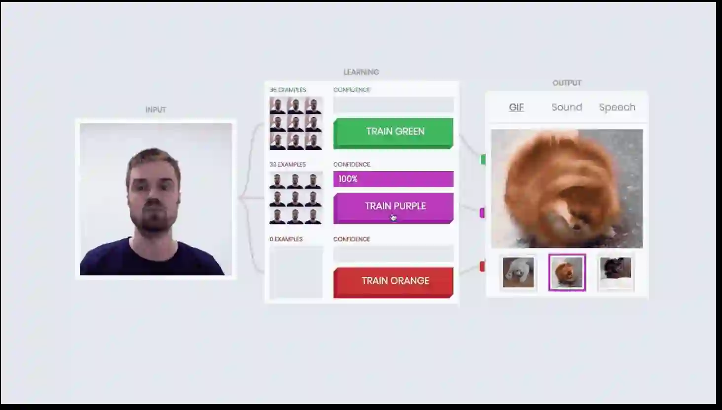 训练过程非常简单。如上图,最左侧是输入框,摄像头实时记录着你的动作、表情等等,作为训练的“输入”;中间是学习框,可以根据不同的输入分成不同的类别;右侧是输出框,可以根据不同的输入,按照不同的类别训练相应的输出结果。