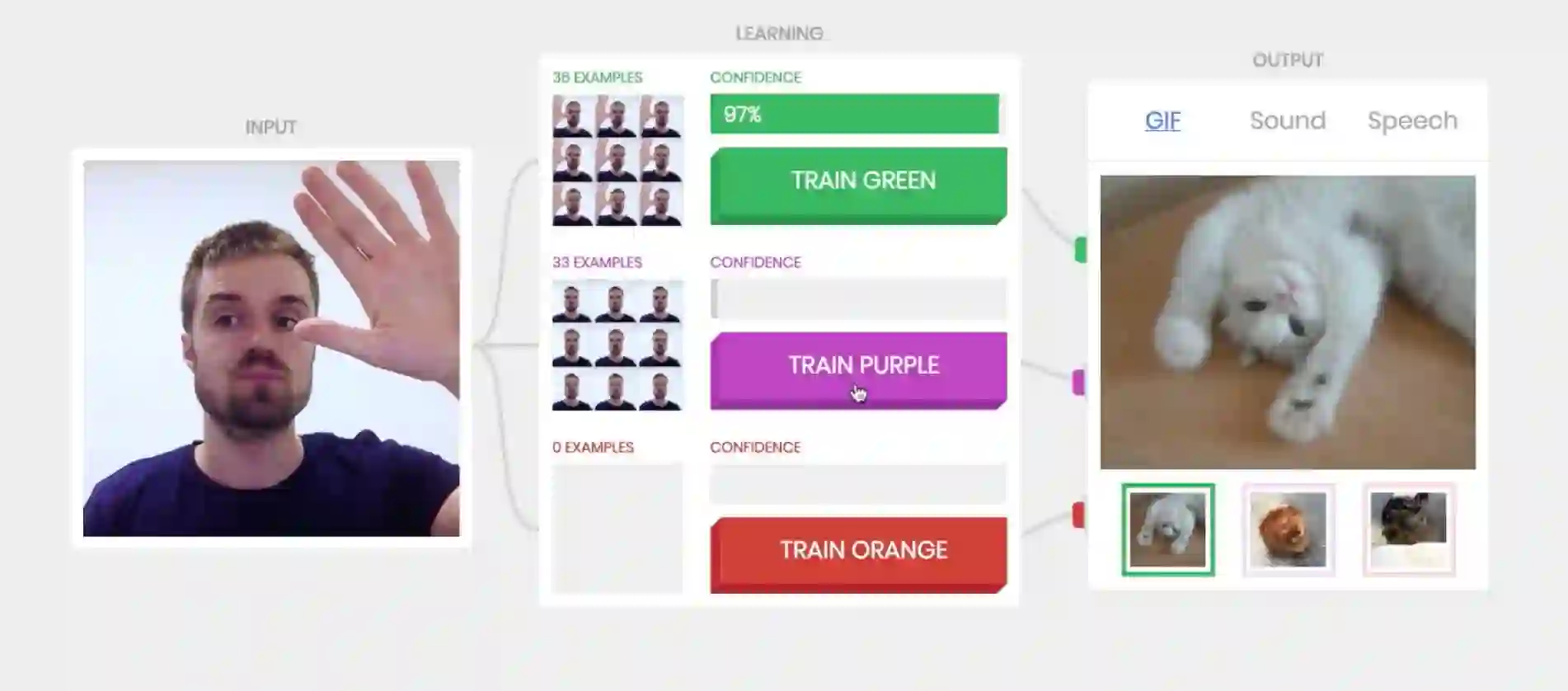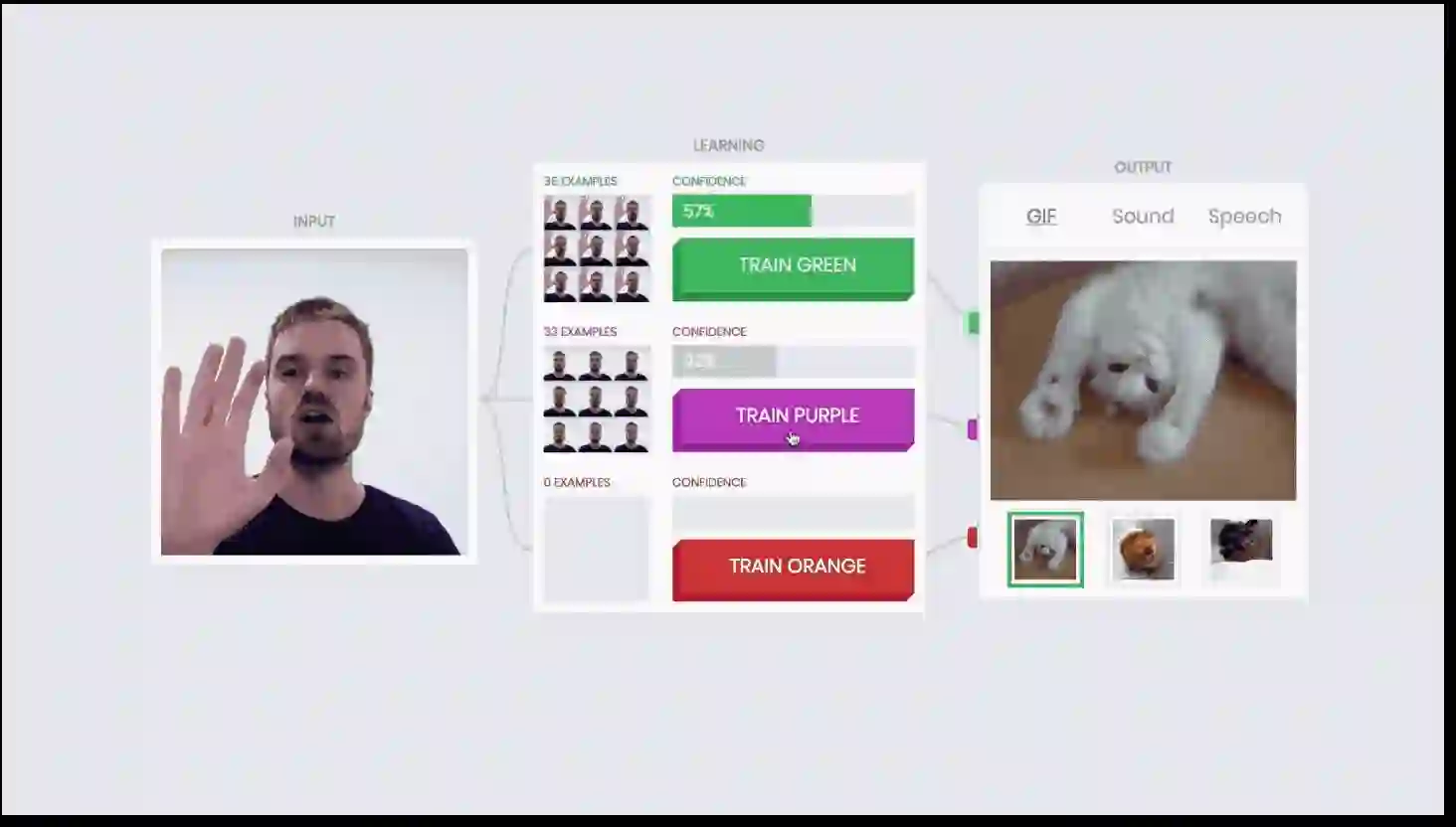 在上图中,实验者训练 AI 在见到他抬起右手后,就显示猫的 gif 图。在只训练了这一项输入的情况下,中间的学习框显示,AI “百分之百”确定这一输入对应的是猫的 gif 图。
