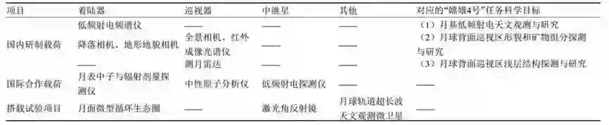 为了实现这些科研目标,嫦娥四号的中继星、着陆器和巡视器上装备了9台高科技设备载荷。包括6台国内载荷与3台国际合作载荷(见图表)。