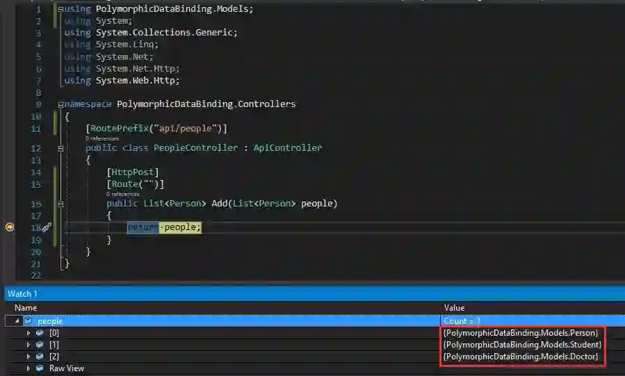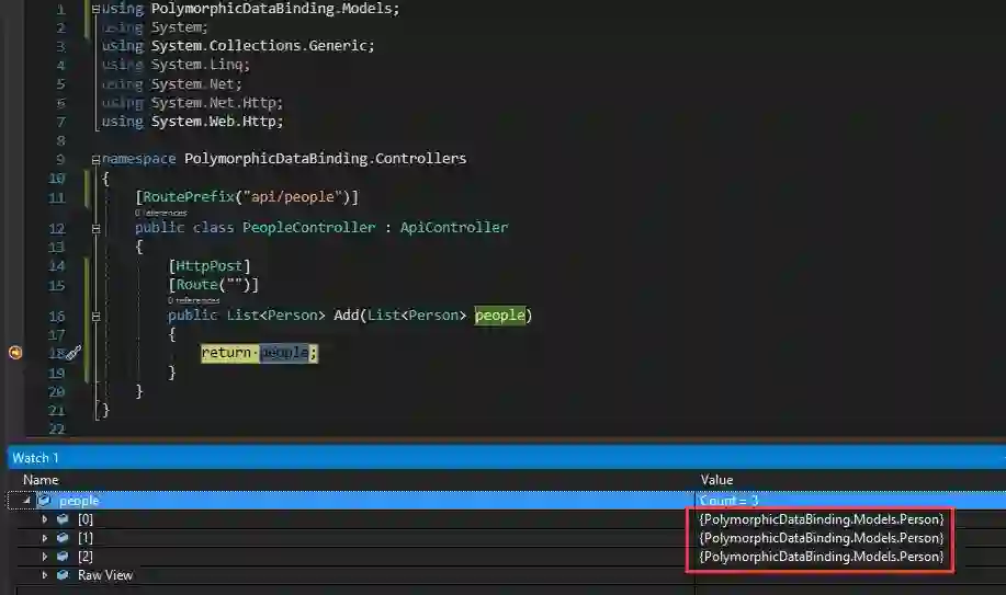 People集合中存放3个People类型的对象, 没有出现我们期望的Student类型对象和Doctor类型对象,这说明.NET Core WebApi默认是不支持多态数据绑定的,如果使用父类类型变量来接收数据,Data Binding只会实例化父类对象,而非一个派生类对象, 从而导致属性丢失。