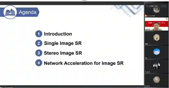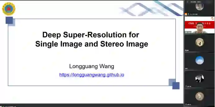 首先由国防科技大学王龙光博士作汇报,他汇报的题目是《单目双目图像超分辨率重建》。王博士先简单介绍了该课题的研究背景,并从单幅图像超分辨率重建任务和双目图像超分任务两个方面来深入浅出地讲解图像超分的相关基础理论知识。随后王博士介绍了在这两个方面上其团队研究成果,即提出的基于对比学习的单图超分工作和基于自建数据集的双目图像超分工作,并展示相关的实验结果。