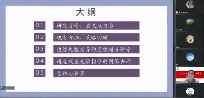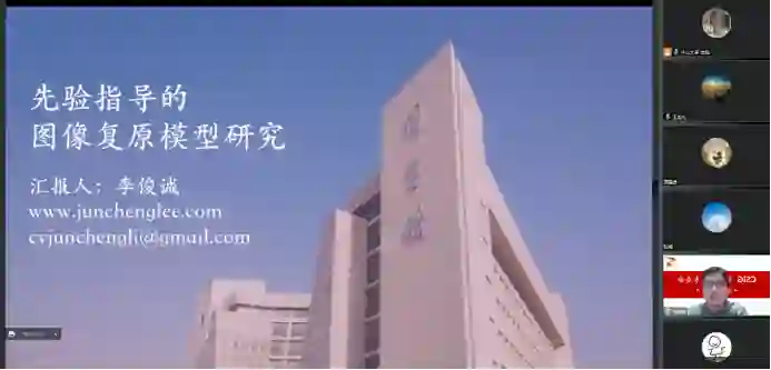 上海大学通信与信息工程学院李俊诚博士报告的题目是《先验指导的图像复原模型研究》。李俊诚博士首先介绍了现有图像复原方法的整体思路,又介绍了引入先验信息的必要性,并分享了他的两篇相关成果。通过理论推导和大量实验验证,有效先验信息的引入可以明显地提升图像复原网络的性能。最后,李博士也和听众们分享了他关于先验指导的图像复原模型的前景和研究趋势。该报告同样引起了听众们强烈的反应和积极的提问。