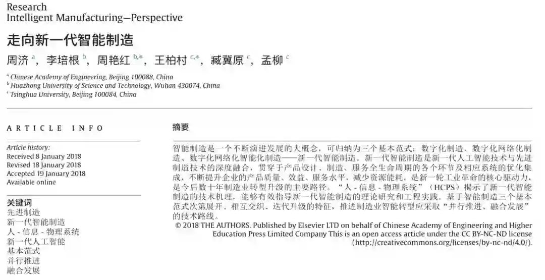 关键词: 先进制造,新一代智能制造,人-信息-物理系统,新一代人工智能,基本范式,并行推进,融合发展