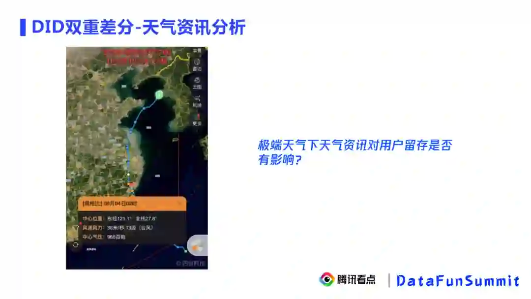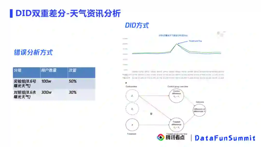 DID在腾讯看点中是一个常用的方法,我们用DID发现了在极端天气下,天气资讯对用户留存的影响。去年8月6号,是台风黑格比经过的时间,我们希望在这样极端的天气下,推送天气的咨询是否能提升用户留存。