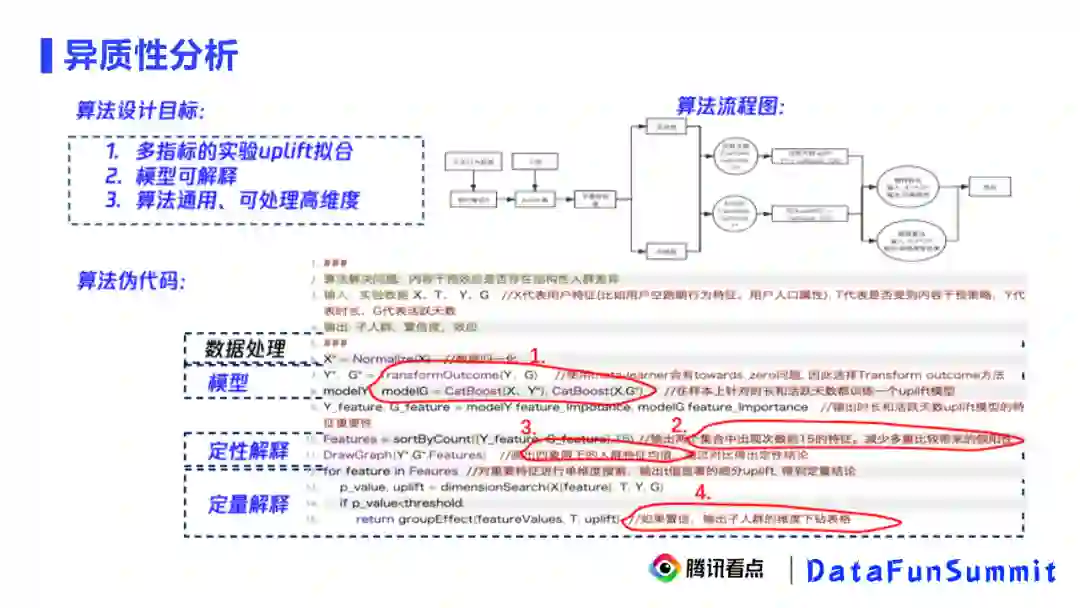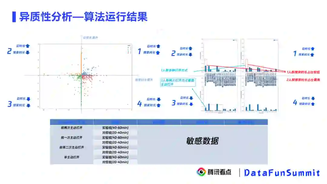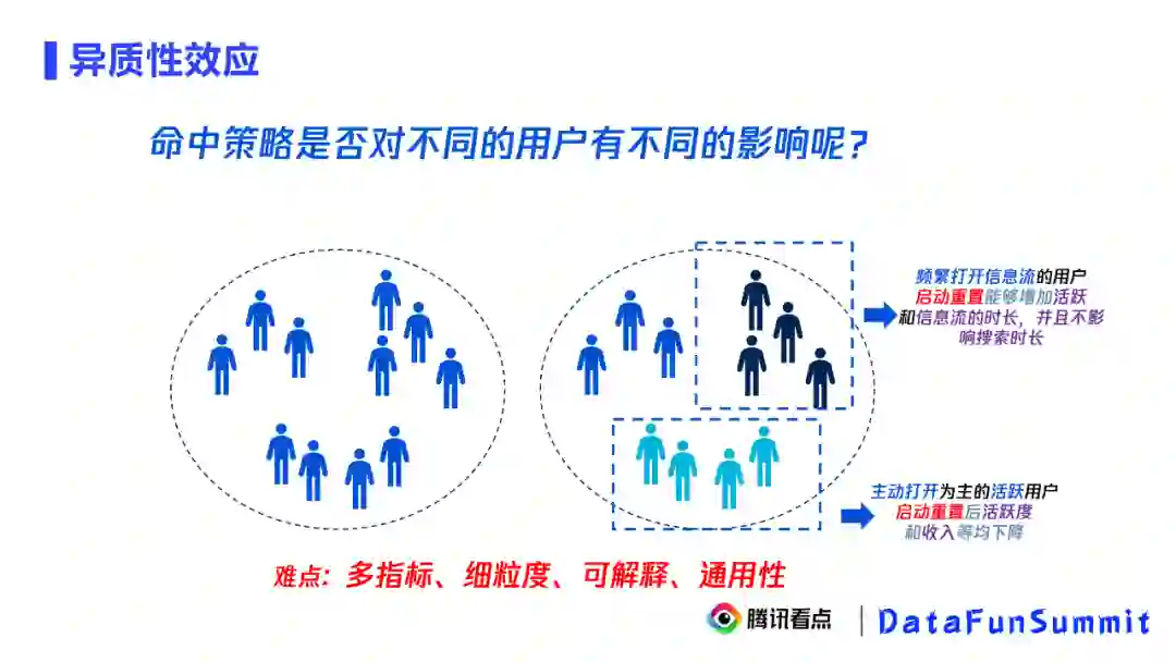 这里的难点是我们的目标指标有多个,包括搜索时长、信息流时长、收入。同时,用户的标签维度很高,包括主动打开、频繁打开信息流等。同时,我们要把这样的结论通过算法解释并满足通用性。需要同时满足这四个要求是个难点。