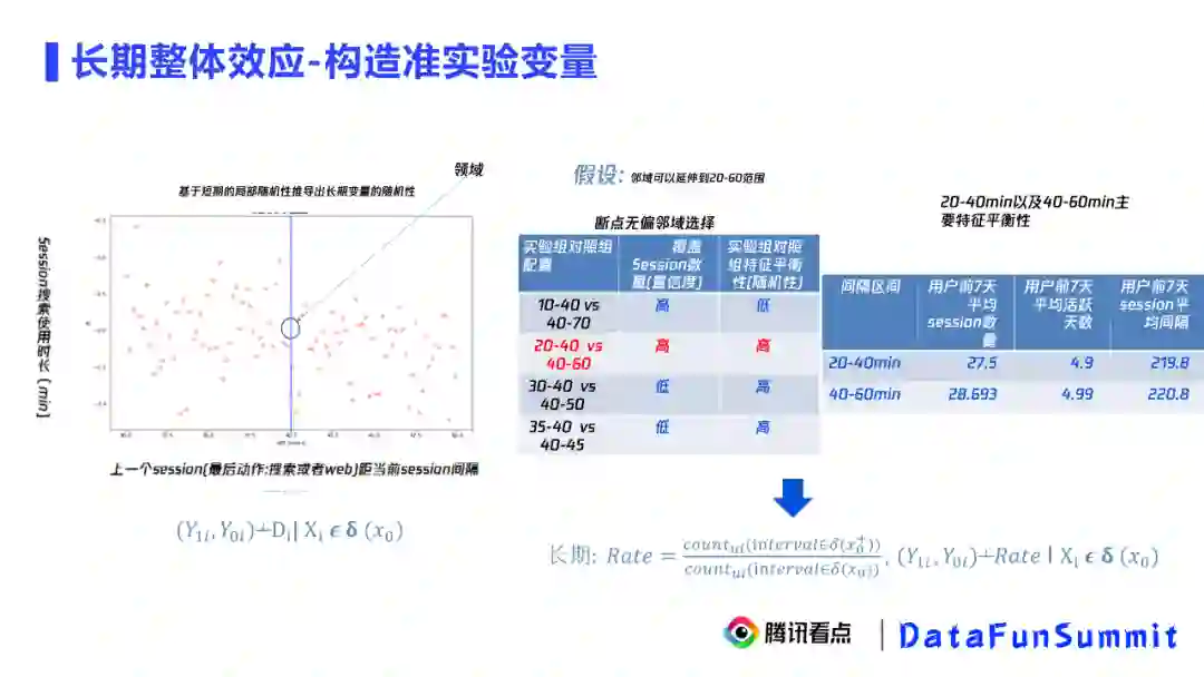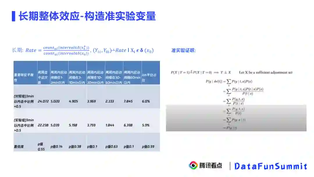 因为我们已经证明了用户的访问行为落在20到40分钟和40到60分钟是一个几乎随机的事件,那么我们可以基于这个事件去构造一个长期的随机变量,就是用户在一段时间内落在40到60分钟的次数除以落在20到40分钟的次数,用这个比例作为长期的准实验变量。