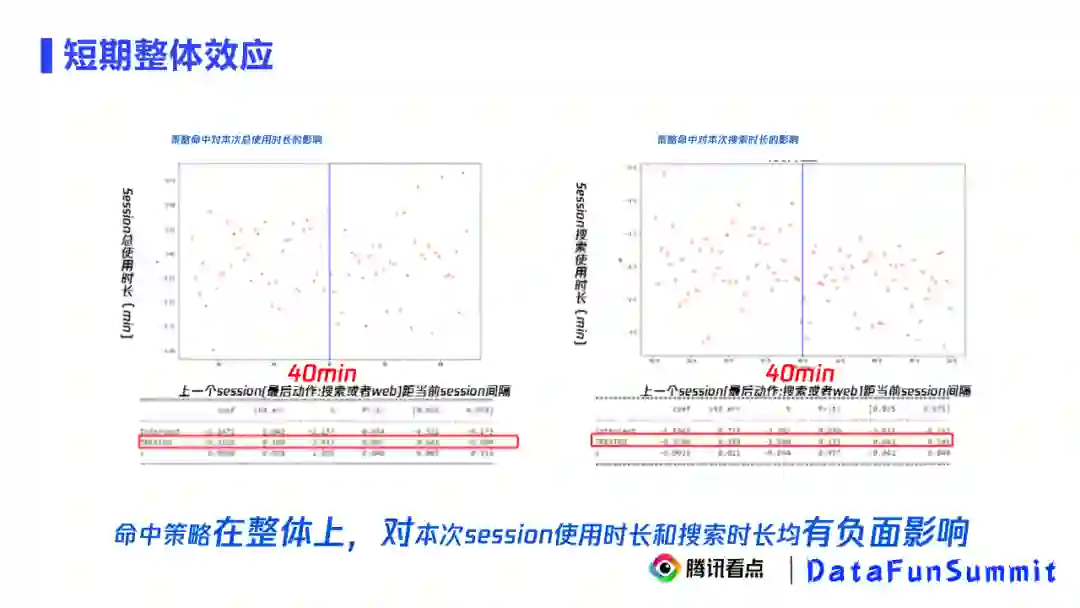 具体来看上面两张图,横轴是用户距离上一次的访问间隔,纵轴是session的总使用时长和搜索使用时长。可以看到这两张图在40分钟左右都有一个明显的断点,也就是说短期看,本次访问被重置会导致本次总使用时长和搜索使用时长都下降,这个结论是置信的。