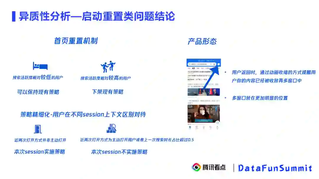 最终我们得到,整体上短期和长期的启动重置策略都有副作用。但区分用户看,可以发现可以对搜索活跃度较低的用户保持现有策略,对搜索活跃度相对较高的用户下架现有策略。更加精细化地,我们可以区分不同session上下文的行为。到这里,我们已经说完了异质性的结论。在分析过程中,我们发现启动重置对搜索用户的影响更大。因此,我们特别对产品平台上做了建议,就是在搜索用户搜索完退出再返回时,切换时增加一个动画,提醒用户之前的上下文已经被收纳到这个窗口里了,让用户主动选择是继续之前的上下文还是来到新的信息流页面。