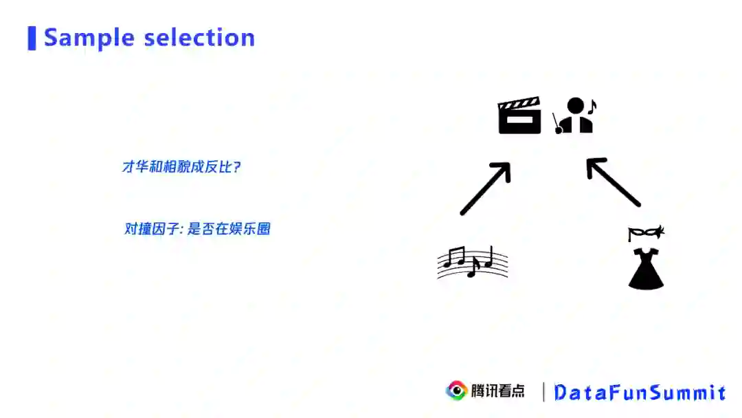 我们常常发现,在娱乐圈中,才华和美貌是成反比的,出现这种现象的原因就是对撞结构,也称之为选择偏差。我们可以看右边的图,其实只要具备才华和美貌中的一项就容易进入娱乐圈,但同时具备才华和美貌本身就是一个小概率事件,所以我们看到娱乐圈中大部分人只具备才华和美貌中的一项,给我们的感觉是他们的才华和美貌成反比。实际上,在全体人群中这两者是没有相关性的,这就是对撞结构。其中,对撞因子是“是否在娱乐圈“,我们只会在娱乐圈看到这种反比。