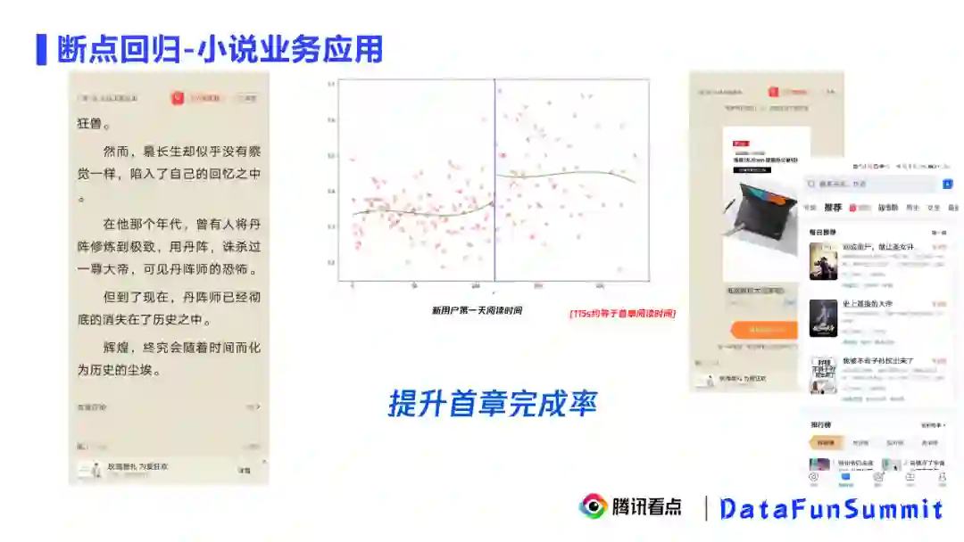 在小说业务中我们发现,提升新用户的首章完成率可以提升新用户的次留。我们可以看到中间这张图,横轴是新用户第一天的阅读时间,纵轴是新用户的次留。我们发现新用户第一天的阅读时间和次留间存在明显的端点,大概在115s左右。这个时间大约是阅读完一章的时间。因为是新用户,所以是新用户的首长阅读时间。因此我们发现了提升新用户的首章完成率对新用户的次留有因果效应。为什么说这是因果效应呢?因为115s左右是一个连续的邻域,我们可以认为其在邻域中各种混淆变量基本不会有太大的差异。根据这个结论,我们应该以提升新用户的首章完成率作为目标。针对这个目标,我们有如下建议: