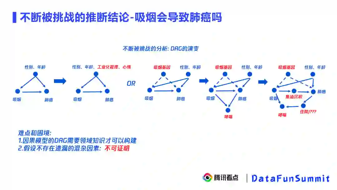 即使做了很大努力,把工业化程度和心情全部固定住了,同时把吸烟基因通过敏感性分析的方法排除了。我们还是会被挑战——可能控制了一个对撞因子,比如哮喘。吸烟和肺癌都会导致哮喘,如果不小心在控制混淆因子的同时控制了对撞因子,那么最终得到的因果关系也是带了相关性的。当然,还有随着因果图的复杂,也会带来很多挑战,相应的因果推断也会发生改变。