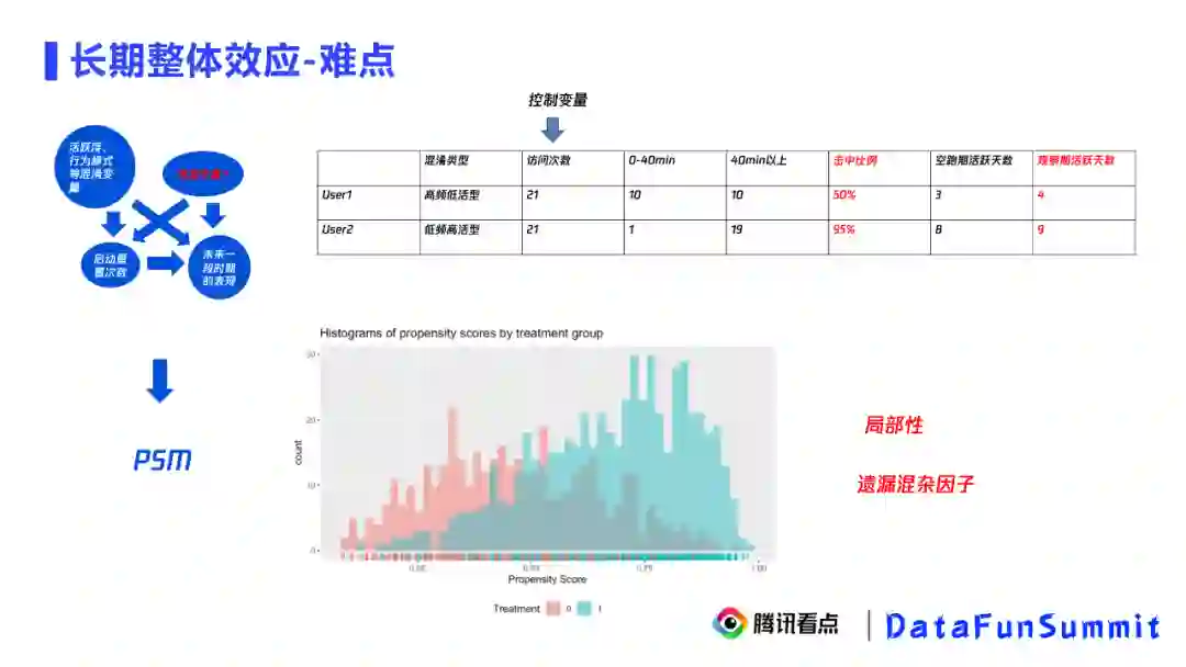 针对长期问题,可以画出如上因果图,考虑一段时间启动重置累积后对用户的影响。长期问题的难点是无法绕开遗漏的混杂因子。比如,我们通过混淆控制的方法去解决这个长期问题,我们先尝试控制用户的活跃度,使其在一段时间内的访问次数都是21,发现击中比例越高的用户的访问天数越多。如果访问次数已经囊括了所有的混淆变量的话,这个结论就是正确的。事实上我们发现,当访问次数都是21的时候,击中比例越高的用户,相当于他们的间隔都比较长,也就是他们是低频高日活型的用户,而击中比例越低的用户,他们正好是高频低日活型的用户。也就是说,我们控制了访问次数,却没有控制住用户的访问模式。这样得出的结论也是错误的。