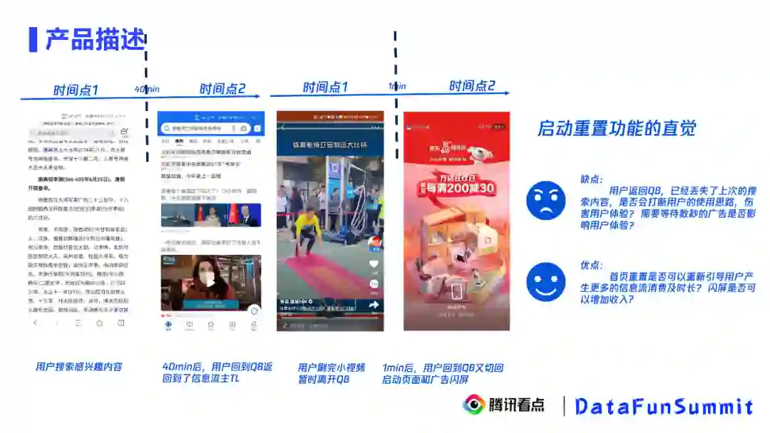 A:用户在上一次访问app后过了一段时间再回来,可能会失去之前的上下文,这个过程叫启动重置。我们评估的是这个设计会不会对效益有负面作用。之前说的20到40分钟或40到60分钟是我们针对我们的数据评估出的随机区间,如果换一个业务场景可能需要通过特征提升性的方法来验证选取的区间是随机的。