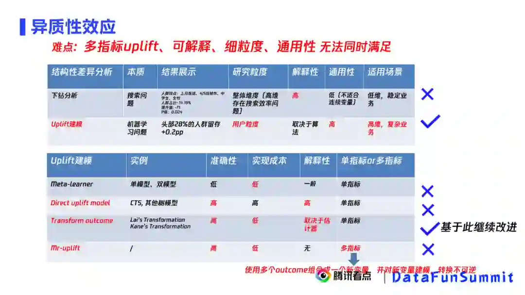 异质性分析的前提是实验数据,或者说准实验数据,如何去获并分析短期和长期干预的准实验数据呢?同时在我们的场景中,我们关注多个指标和解释性,异质性没有一个直接可以满足的方法。那么现有的下钻分析和uplift能满足这样的目标吗?