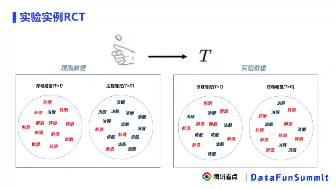 观测数据中,“穿鞋睡觉“作为实验组,但其中大部分人都是醉酒的,“脱鞋睡觉”作为对照组,但其中大部分人都是清醒的,因此我们看到“穿鞋睡觉”的实验组里中大部分人都醉酒,得出“穿鞋睡觉”导致醉酒(”第二天起床头疼“)的错误的因果关系。我们可以清楚地看到混淆对因果关系的影响,我们发现两个组醉酒的分布是非常不平衡的。