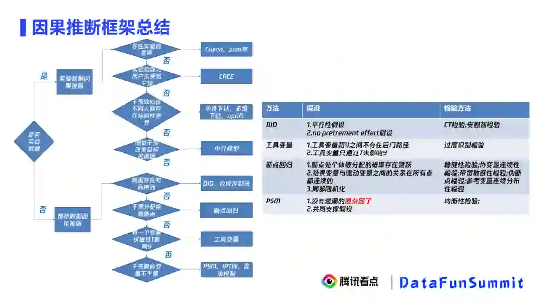 为了绕开观测数据因果推断的问题,我们引入了准实验。从目前因果推断整体的分析框架中可以看到准实验所处的位置,左图包含实验数据和观测数据的因果推断。其中,在观测数据的因果推断中,我们会优先看数据是否满足DID(Differences In Difference,双重差分)、工具变量和断点回归的前提要求。如果满足,会优先使用这三种方法;如果不满足,才会使用PSM(Propensity Score Matching,倾向评分匹配)和混淆PSM方法。这种优先级的原因是相比于PSM,前三种方法绕开了混杂因子,这是唯一的也是最重要的区别。因此它们依赖的假设在业务层面更容易得到满足,同时也很容易被检验,这样的结论也更容易被信服。我们把上面的三种方法称为准实验方法。下面,我们来看看准实验方法在腾讯看点中的应用案例。