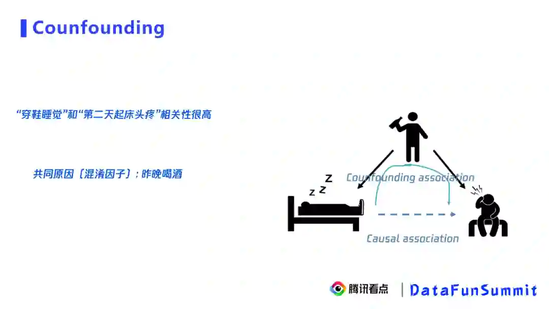 我们拿“穿鞋睡觉“和”第二天起床头疼“来说明由混淆因子带来的相关性。比如,在一个数据集中,我们发现”穿鞋睡觉“和”第二天起床头疼“的相关性很高,因此我们可能推断出”穿鞋睡觉“会导致”第二天起床头疼“。事实上,我们知道在医学中这条有向边是不存在的。那么,这样的相关性是谁带来的呢?我们又看了下数据,发现在数据集中有”昨晚喝酒“这个变量,并且”穿鞋睡觉“的人大部分是”昨晚喝酒“的人。事实上,”昨晚睡觉“会导致”第二天起床头疼“在医学中是具备因果性的,因此最终间接导致了我们看到的“穿鞋睡觉”的人“第二天起床头疼“的比例很高,这就是混淆结构。其中,同时影响”穿鞋睡觉“和”第二天起床头疼“的变量”昨晚喝酒“就是混淆因子。