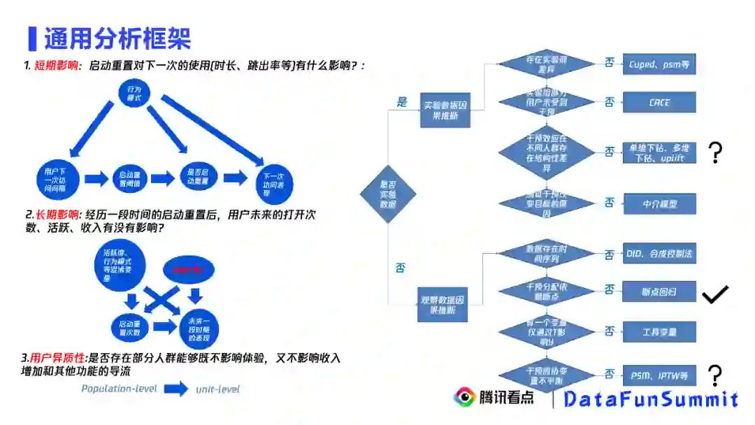 针对这类问题,我们提出一套通用的观测数据因果推断分析方式来给出答案。我们主要关注三个问题,第一个问题启动重置对下一次的使用有没有影响? 第二个问题 一段时间的启动重置下来对用户的未来的打开次数,活跃,收入是否有影响? 前两个问题解决后,我们关心是否存在部分人群能够既不影响体验,又不影响收入增加和其他功能的导流。这三个问题又称为短期影响、长期影响和用户异质性分析。