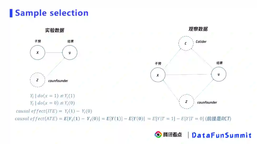 从左图中可以看到,实验相当于取消了干预在因果图上所依赖的父节点,让干预的分配只依赖于一个随机变量。这时可以证明,在整体人群中的因果效应,我们称之为ATE,等于相关性。这里的关键是用户是被随机分配的,当没有随机条件时,ATE公式(尤其是加粗的部分)将无法成立。比如,在右图观测的数据中,干预是受到混淆变量Z的影响。在这种情况下,加粗部分不成立,我们也就无法通过相关性直接得到因果性。